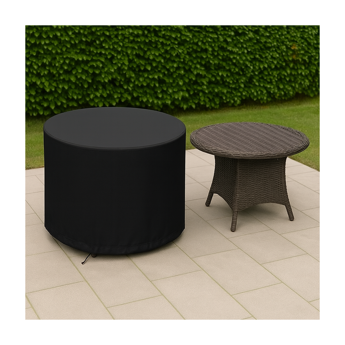 Nos housses sont confectionnées en toile polyester enduit PVC ≈ 300 g/m². Ce matériau est imperméable, anti-UV, résistant à la déchirure tout en restant souple et facile à manipuler. Il offre une protection optimale contre les intempéries et convient parfaitement aux tables de jardin rondes.