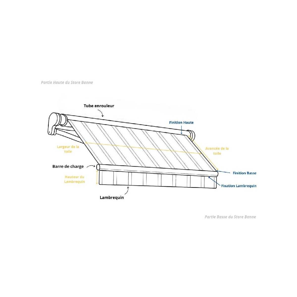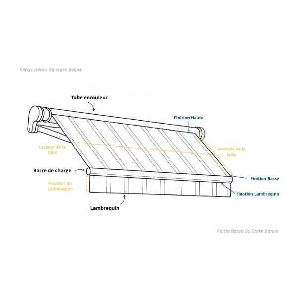 Mesurez la largeur totale du store (bras compris) ainsi que l’avancée lorsque le store est entièrement déployé. N'oubliez pas de mesurer la hauteur du lambrequin si vous souhaitez le remplacer.