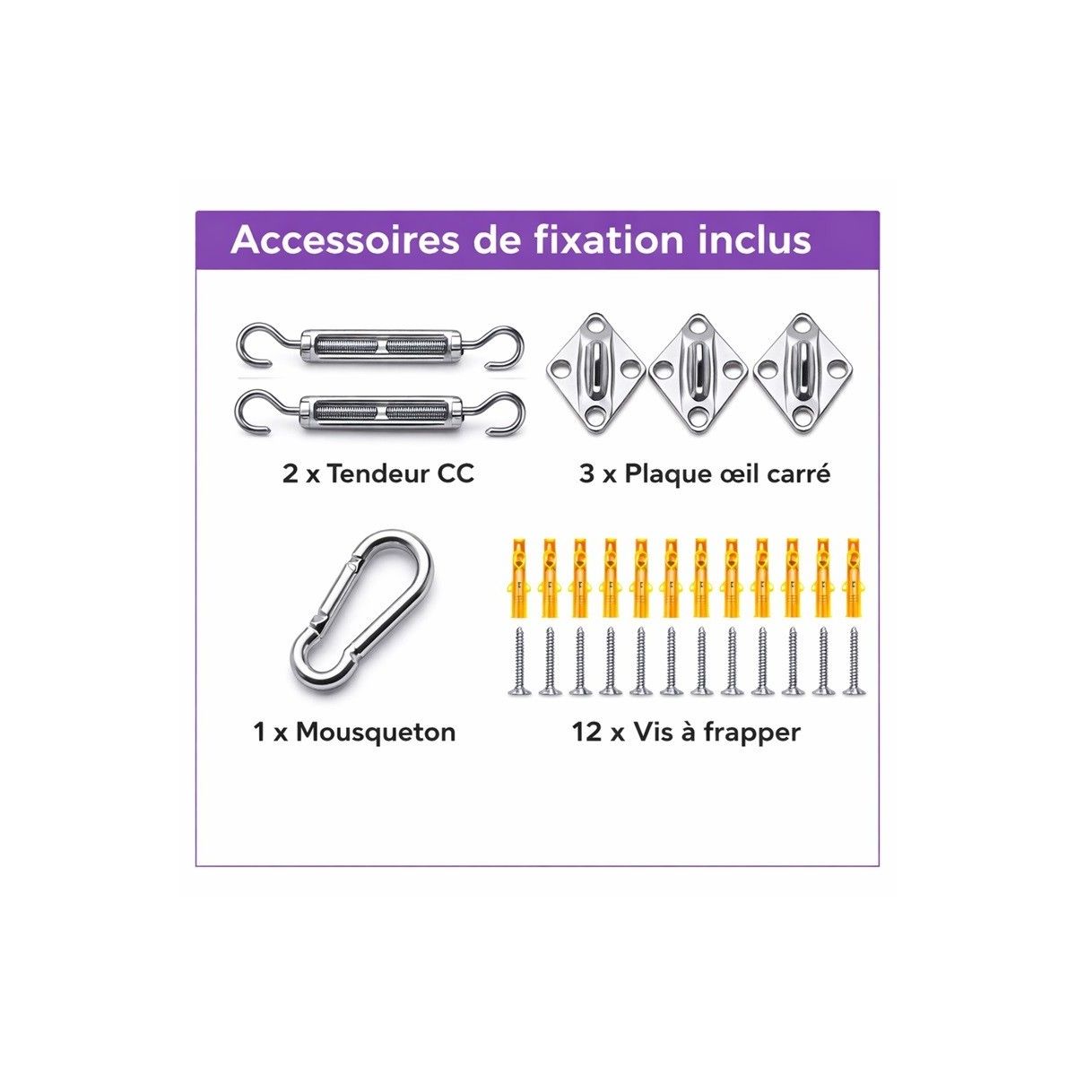 Chaque angle de la voile doit être fixé à un point solide à l’aide de cordes, tendeurs ou mousquetons.